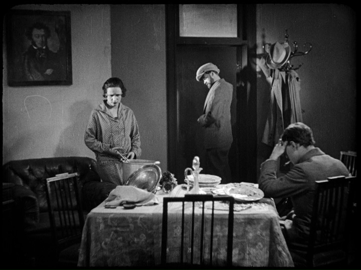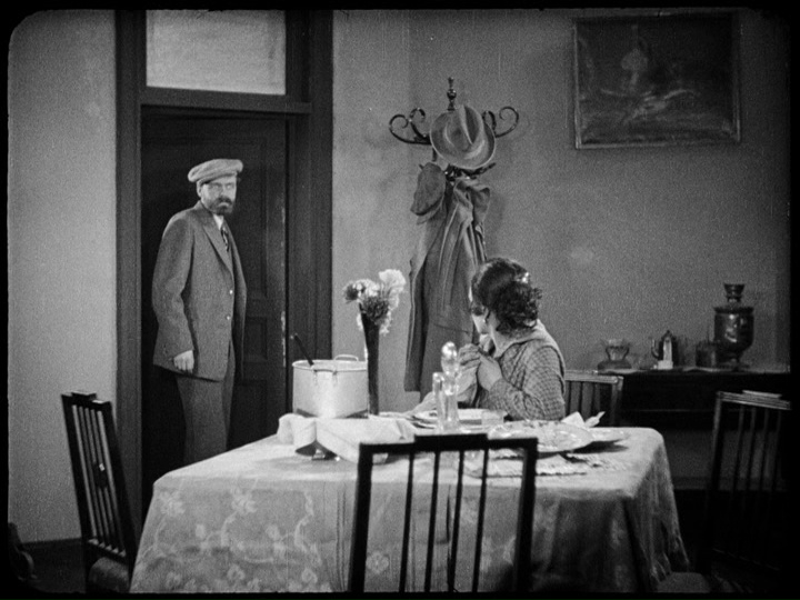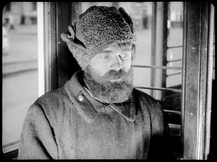 This sense of ambiguity is part of the film’s fascination. While Ermler offers some superb sequences and images, the film is often so convinced of its own effectiveness as propaganda that it simply overlooks the possibility that we might think differently. Our sympathies – especially as viewers nearly a century later – are liable to wander from the official line. Filimonov’s questioning of the Soviet world might encourage us to question it too. And the more he becomes convinced by this new world, the more he becomes a different person. His final line, which is also the final line of the film, is delivered straight to camera: “We still have a lot of work to do, comrades”. Immediately following the violent altercation between Filimonov’s ex-wife and her husband, there is an implication that personal change must accompany social change. But with Filimonov himself, this change is also a loss. The way he now appears before us – his beard neatly trimmed, his clothes neatly worn, his hat neatly fashionable – makes him a different man than the one who initially went in search of his wife. He resembles the other workers, the men and women he had found so alien and threatening, and he now echoes the way they speak. Yes, he has grown up, he has awakened, he is no longer hysterical. But there is a nagging sense that something else has happened. It is as if Filimonov has been uncannily replaced. This new Filimonov is a sinister doppelganger of the man we used to know. His last line is both an encouragement and a threat.