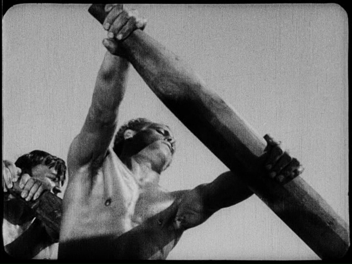 Likewise, the scene in which Filimonov demands, screaming, to know who the “master” is ends with a long montage sequence that tries to answer his question. We see a kind of cross-section of Soviet Russia, its workers and fighters and factories etc. It is impressive for its leaps between similar images (wheels, cogs, hands etc) but it really doesn’t have an argument. It’s a kind of statement of might that just gets more insistent, not more complex or convincing. When it ends and the worker asks Filimonov (and, by extension, us) “Understand?”, we cannot answer: there is nothing to understand. The rapid montage hasn’t made an argument or an effort to answer our question, it’s simply given us a slap. Filimonov – the focus slowly pulling from the background of the factory to his face in the foreground – is breathing heavily and dishevelled, but he starts to grin. Though the film would have us believe he has now finally woken up to the marvels of his new life in this new reality, he resembles a man who has not so much found his sanity as fully embraced his insanity. His grin turns into a laugh, and he hurls himself at his comrades, kissing and hugging them like… well, like a madman. Everyone is so nice to him, and he looks so ecstatically happy, that the scene works – but the pleasure it gives in showing Filimonov released from his torment is (for us, a century later) tinged with a different kind of emotion.
